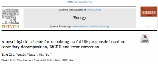 近日,pg电子官网博士朱婷、教授王文波、老师喻敏合作在《Energy》期刊上发表题为“A novel hybrid scheme for remaining useful life prognostic based on secondary decomposition, BiGRU and error correction”的研究论文。该期刊系JCR及中科院SCI双一区TOP期刊,2022年影响因子为8.857,该期刊重点关注能源经济分析、能源建模和预测、综合能源系统、能源规划和能源管理,是能源研究领域内最有影响力和最权威的期刊之一。朱婷博士为第一作者,王文波、喻敏为共同通讯作者,pg电子官方网站为第一单位。