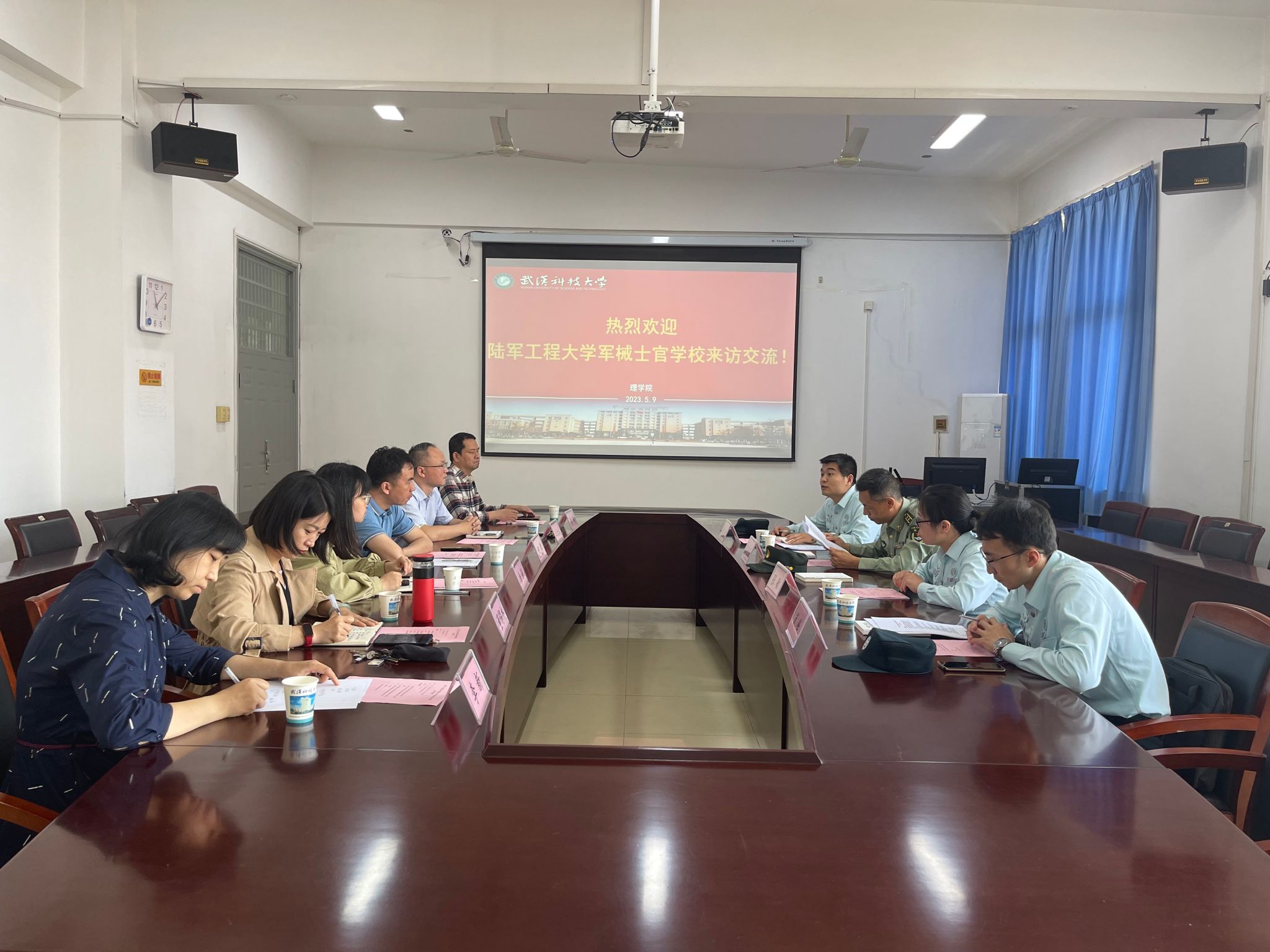 5月9日上午,陆军工程大学军械士官学校基础部协理员王志国、教研室主任张敏、教员徐兵等一行来到理学院就物理实践创新方面进行交流访问。pg电子官网副院长何理、应用物理系领导班子成员及部分教师参加交流会。本次会议在教二楼六楼会议室召开,由理学院党委副书记余婷主持。