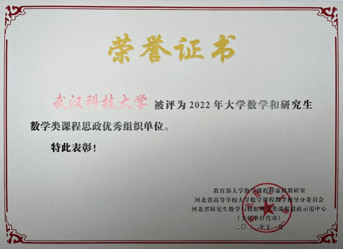 pg电子官方网站被评为2022年大学数学和研究生数学类课程思政优秀组织单位,pg电子官网教师蒋君被评为大学数学和研究生类课程思政教学名师;龚谊承获得大学数学和研究生数学类课程思政教学优秀案例特等奖,蒋君、李春丽、张青、张学英获得一等奖,咸艳霞获得二等奖。