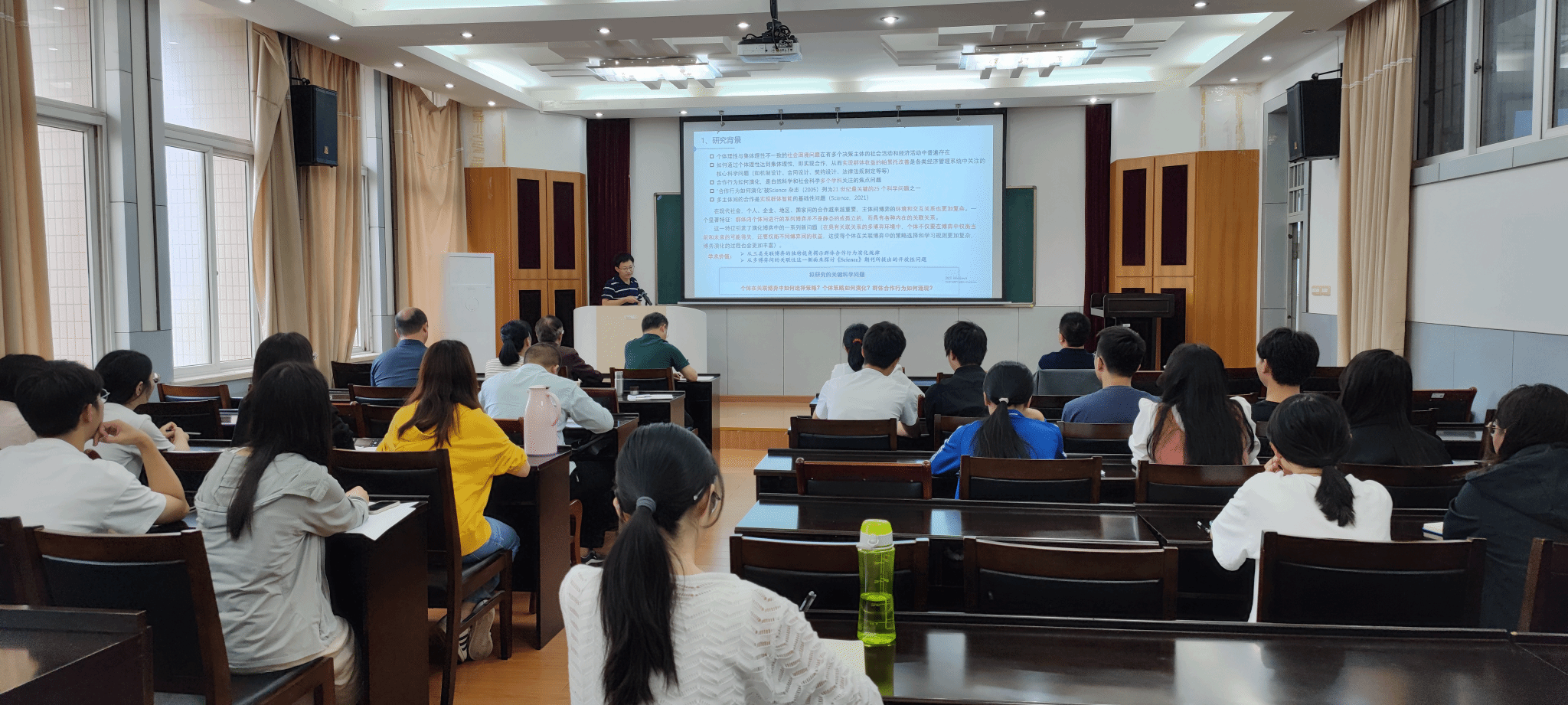 (通讯员苏青青)9月21日下午,武汉大学陈振颂副教授、武汉理工大学全吉教授应邀为pg电子官网作学术报告,题目分别为“Multi-objective optimization-based collective opinion generation with fairness concern”和“关联社会困境博弈中的策略演化与群体合作涌现”。报告会由pg电子官网院长丁义明教授主持。武汉大学王先甲教授、pg电子官网教师代表和研究生代表参加了此次报告会。