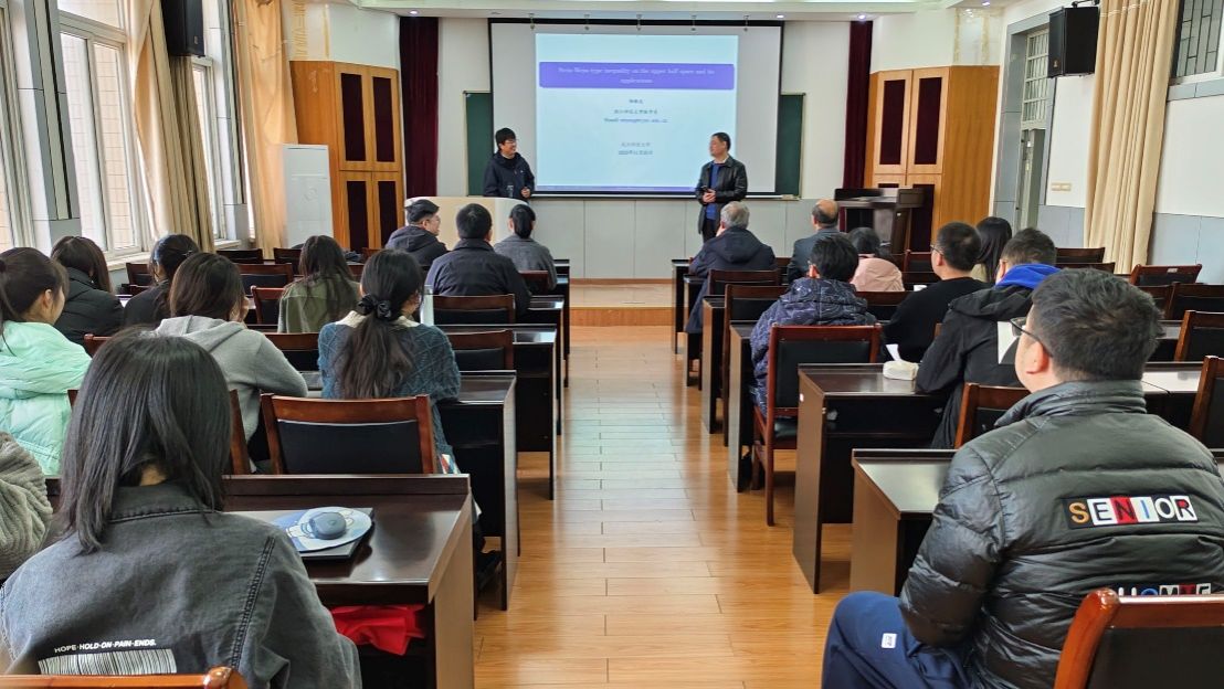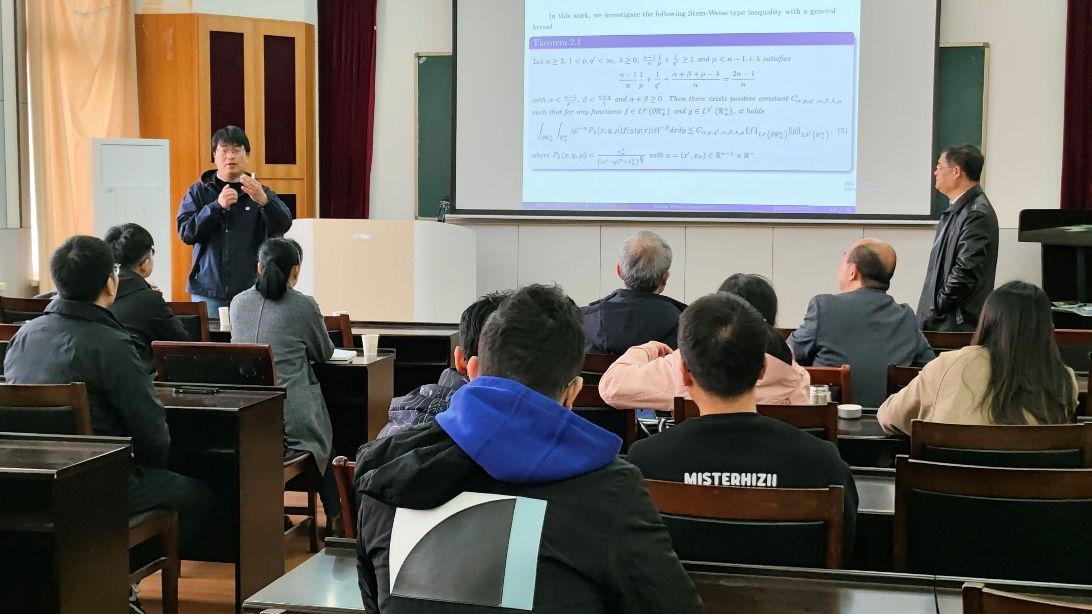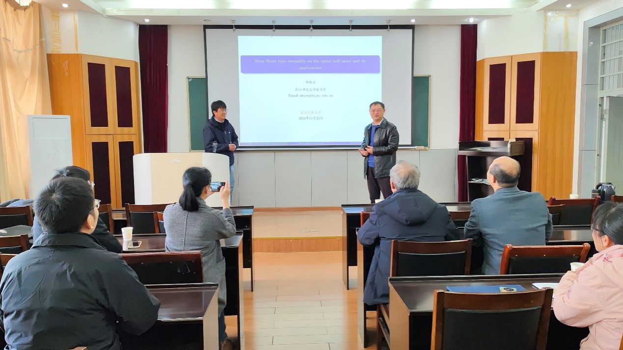 (通讯员虞中华)11月25日,浙江师范大学数学科学学院院长杨敏波应pg电子官网邀请,在教二楼五楼学术报告厅作题为“Stein-Weiss type inequality on the upper half space and its applications”的学术报告。本次报告会由pg电子官网院长丁义明教授主持,pg电子官网部分教师及研究生参加。