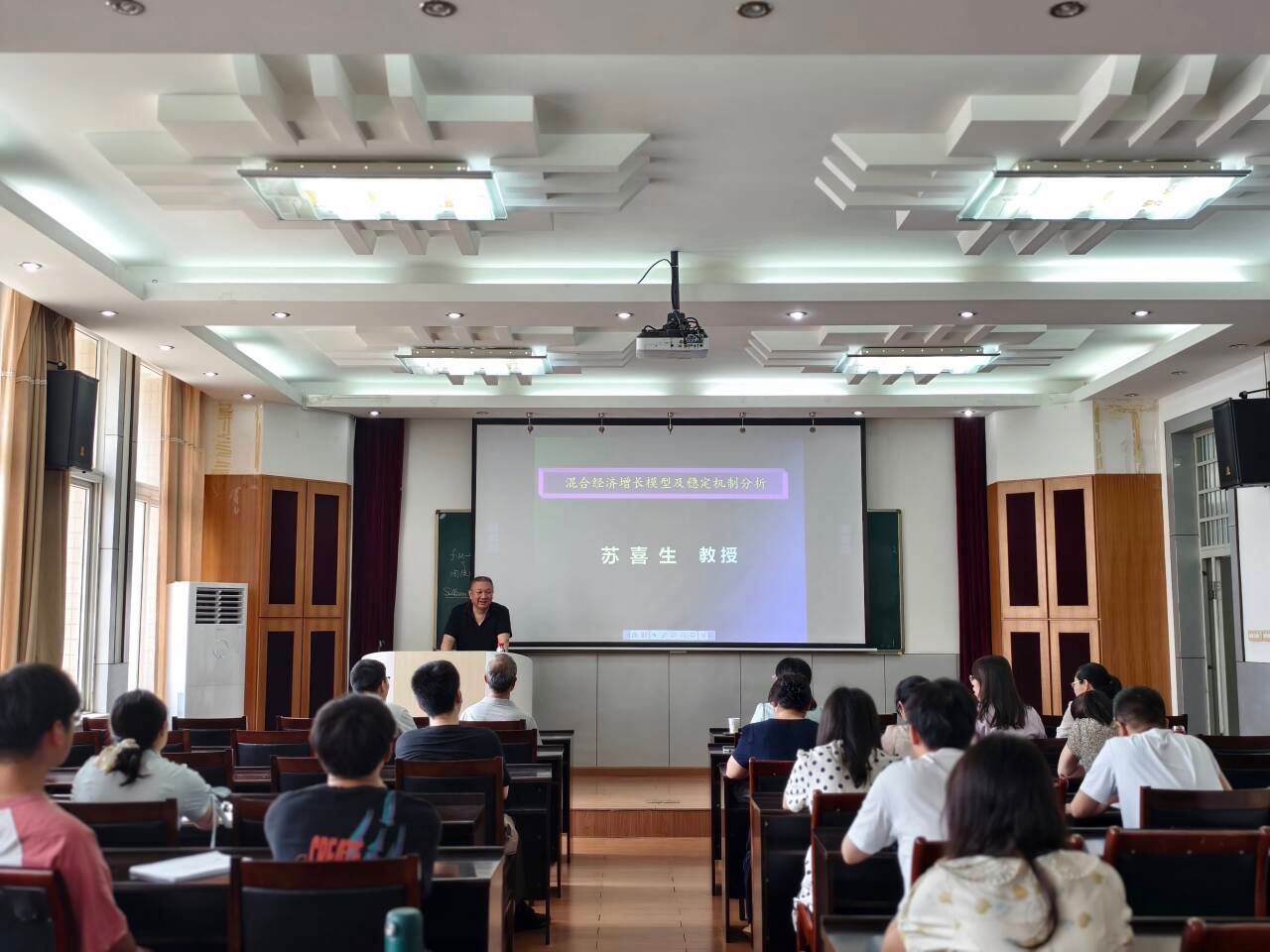 报告在理学院学术报告厅22515教室举行,苏喜生教授首先分析了全球经济发展的深刻变革,特别是智能化技术对经济增长的推动作用。他指出,全球供应链重构和地缘政治矛盾等因素对经济增长的稳定性构成了挑战。在这种背景下,计划与市场相结合的混合经济模式成为各国经济运行的首选模式。