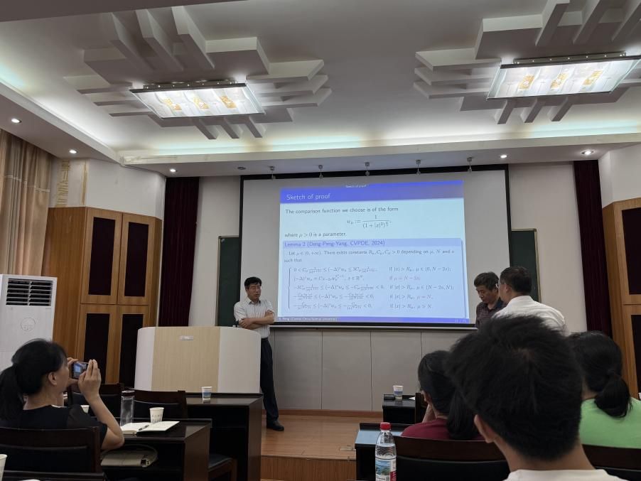 学术报告互动环节,两位教授与在场师生进行了深入的交流和讨论,耐心解答了师生们提出的问题,并向大家简要介绍了非线性偏微分方程领域的最新进展。青年教师李奇表示“报告中对‘非线性项最优指数’的探讨,为我的研究方向打开了新思路,尤其是不同衰减位势条件下的结论具有潜在的跨学科应用价值。”
