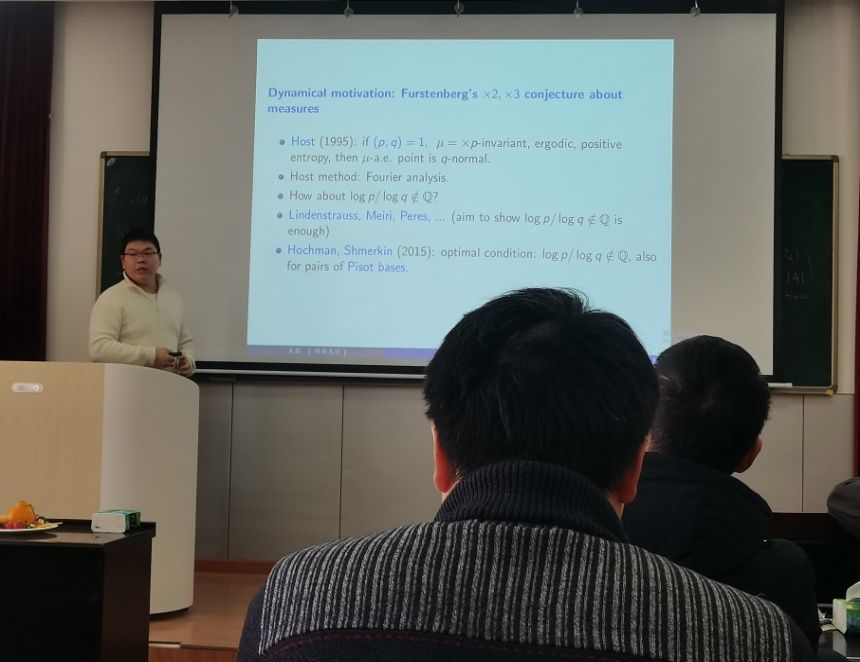 李兵教授的报告题目为“ Some problems related to times 2 and times 3 ”,系统介绍了 乘 积 动力系统(如乘2、乘3变换)中的数论与分形几何交叉的若干前沿问题。 报告的 核心研究 来源于著名的 Mahler问题 ,即Cantor中的点可以被有理数逼近得“有多好”。具体来说,李兵教授重点介绍了可很好逼近集和字符缺失 集的交集 问题、不可很好 逼近集 和分形集的交集问题 等 , 揭示 了可很好 逼近 集与字符缺失 集的交集 的大小 与实数的进制展开结构及有理数分母之间的乘法独立 性密切相关。 由此,李教授进一步引出了著名的 Furstenberg 的猜测 及其相关的水平集问题 。报告最后介绍了Schmidt游戏、赢集、自共形集 等 重要内容 ,充分展示了该研究方向丰富的结构与大量尚待解决的开放问题。