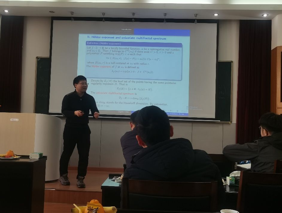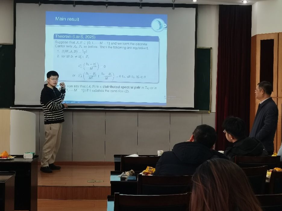 史汝西教授的报告题目为“ Fractal uncertain principal and distributed spectral set ”,主要探讨了 离散 Cantor 集上的分形不确定性原理 。史汝西教授首先介绍了 分形不确定性原理表明 一个函数不可能在 位置空间 和 频率空间 中同时高度集中于同一个分形集合附近 。其次,在此 框架下 ,史教授介绍 了达到最不确定指数的一个充分必要条件 , 该条件可以刻画为 分布式谱对 。最后,介绍 了若干循环群 中的分布式谱对,并给出了部分情形下的 完全分类结果 。