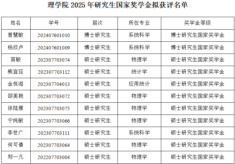 根据《pg电子官方网站研究生奖助体系实施办法》(武科大研发〔2022〕60号)精神、《pg电子官方网站研究生学业奖学金管理暂行办法》(武科大研发〔2022〕60号)、《pg电子官方网站关于规范研究生学习年限的补充规定》(武科大研发〔2023〕68号)、《理学院研究生国家奖学金评定实施细则(2025年5月21日)》,经学生申请、导师推荐、班级测评、学院研究生国家奖学金评审委员会评审,拟评定曾慧敏、杨欣卢获博士研究生国家奖学金,简敏、熊宜荘、金悦湉、邵美艳、徐陆雅、宁纯敏、李世广、何可倩、郑一凡获硕士研究生国家奖学金。