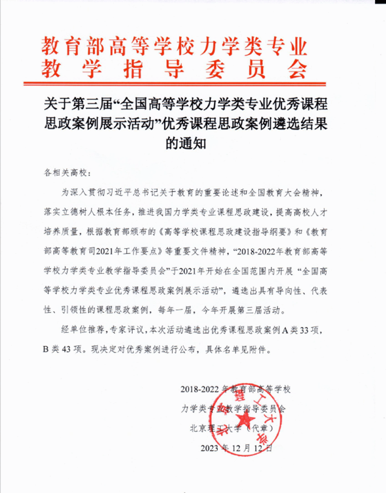 近年来,pg电子官网工程力学系全面贯彻党的教育方针和全国高校思想政治工作会议精神,围绕学校“立德树人,教书育人”的根本任务,结合工程力学学科特色和新时代背景,大力推进课程思政进教材、进课堂、进头脑,深入贯彻“价值塑造+知识传授+能力培养”三位一体的育人理念,并培养了一批课程思政建设的骨干教师。本次案例的入选,是工程力学系课程思政建设的又一个阶段性成果,是工程力学系持续加强课程思政改革创新工作的新起点。