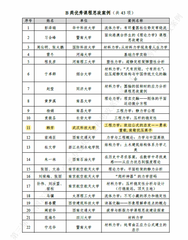 12月14日,从教育部高等学校力学类教学指导委员会获悉,pg电子官网工程力学系韩芳副教授的课程思政案例入选第三届“全国高等学校力学类专业优秀课程思政案例展示活动”优秀课程思政案例。经单位推荐、专家评审,本次活动共遴选出优秀案例A类33项,B类43项。工程力学系韩芳老师的“工程力学:欧拉公式的启发——勇承重载,致敬抗压高手”被评为B类优秀案例。本次遴选湖北省高校仅有2项入围,pg电子官网1项。