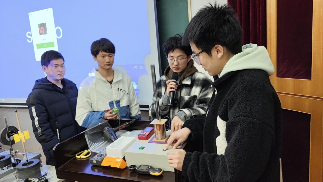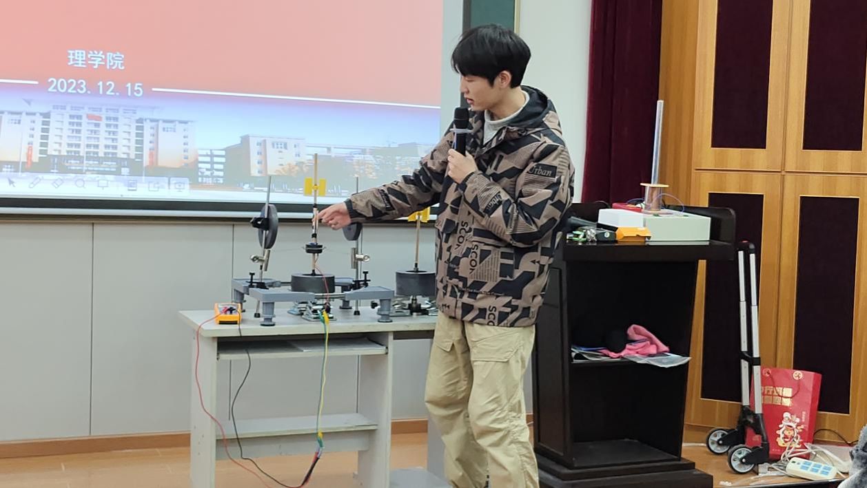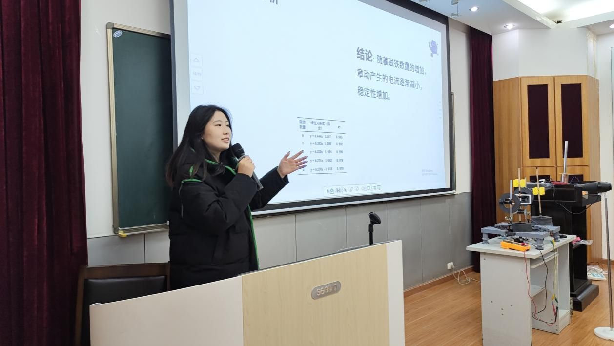“杆的上方安装扇叶,杆的两侧安装铜线圈和环形磁铁,杆在旋转切割磁感线时产生电流,从而具有稳定性。”材物2001班孟港向学生展示了实验仪器并进行了相关操作,通过改变量化磁铁的数目和风速来验证其对装置稳定性的影响。他建议学生们跳出传统的研究框架,以全新的视角去看待和解决问题,将理论运用到实际上,构造出独立的物理模型。