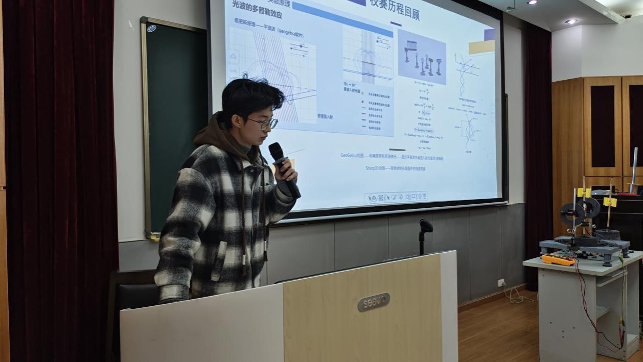 材物2101班舒俊对全年的历程进行了一个回顾,比较了国赛和省赛的区别,分享了答辩的经验。当谈到国赛时,他表示,国赛主要考察物理思维和学生的参与度,因此合作显得十分重要,他建议小组成员聚在一起思考讨论,而不是将任务分配给个人。