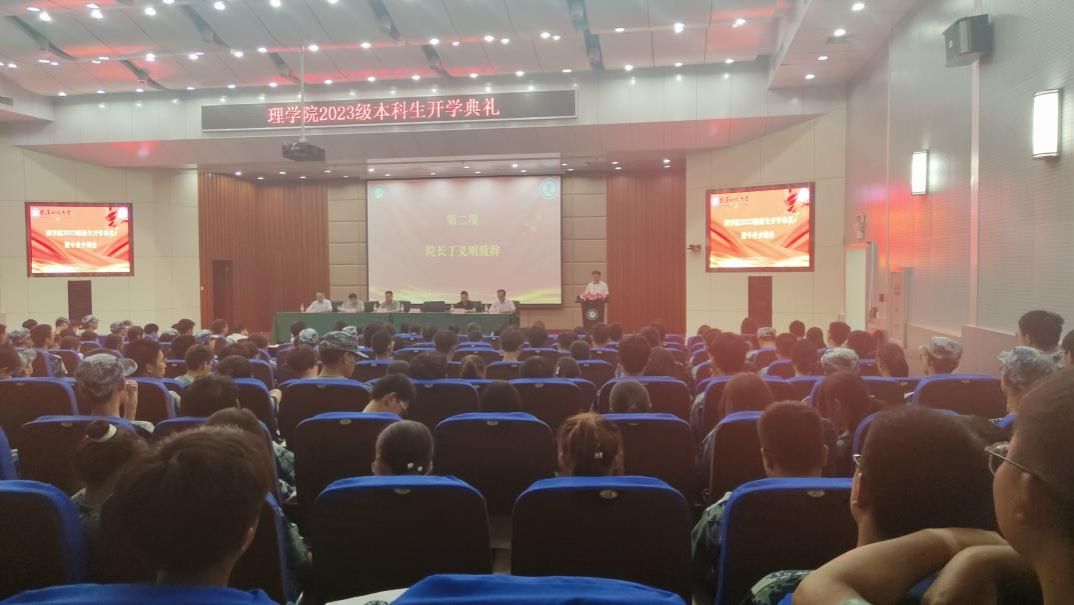 在庄严的国歌声中,典礼正式开始。院长丁义明致辞,他代表理学院对2023级新生的到来表示热烈欢迎,介绍了pg电子官网的发展情况,各专业的特色及师资队伍。丁义明鼓励新生们以“明理厚德,求实鼎新”的姿态,与学院共成长,不懈奋斗,迎接“蓬勃理院,一往无前”的骄傲时刻。