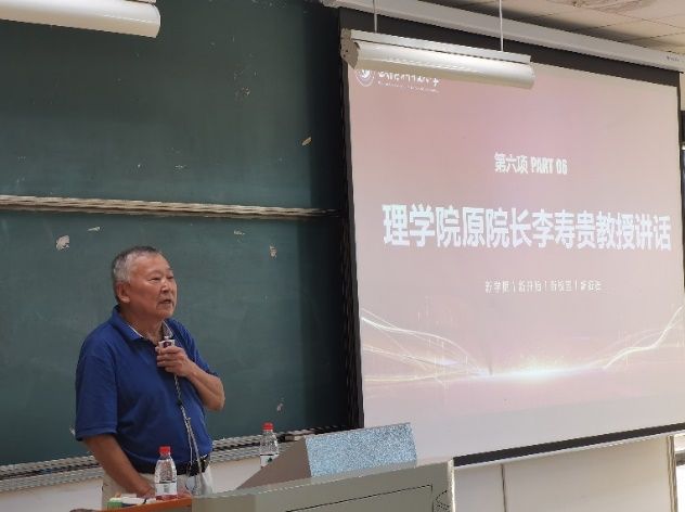 理学院前任院长李寿贵老师对新生分享了理学院近几十年的发展历史,并介绍了在理学院发展进程中涌现出来的一批国内外知名专家学者。通过老领导的分享,增强了全体研究生同学对理学院的认同感与归属感。