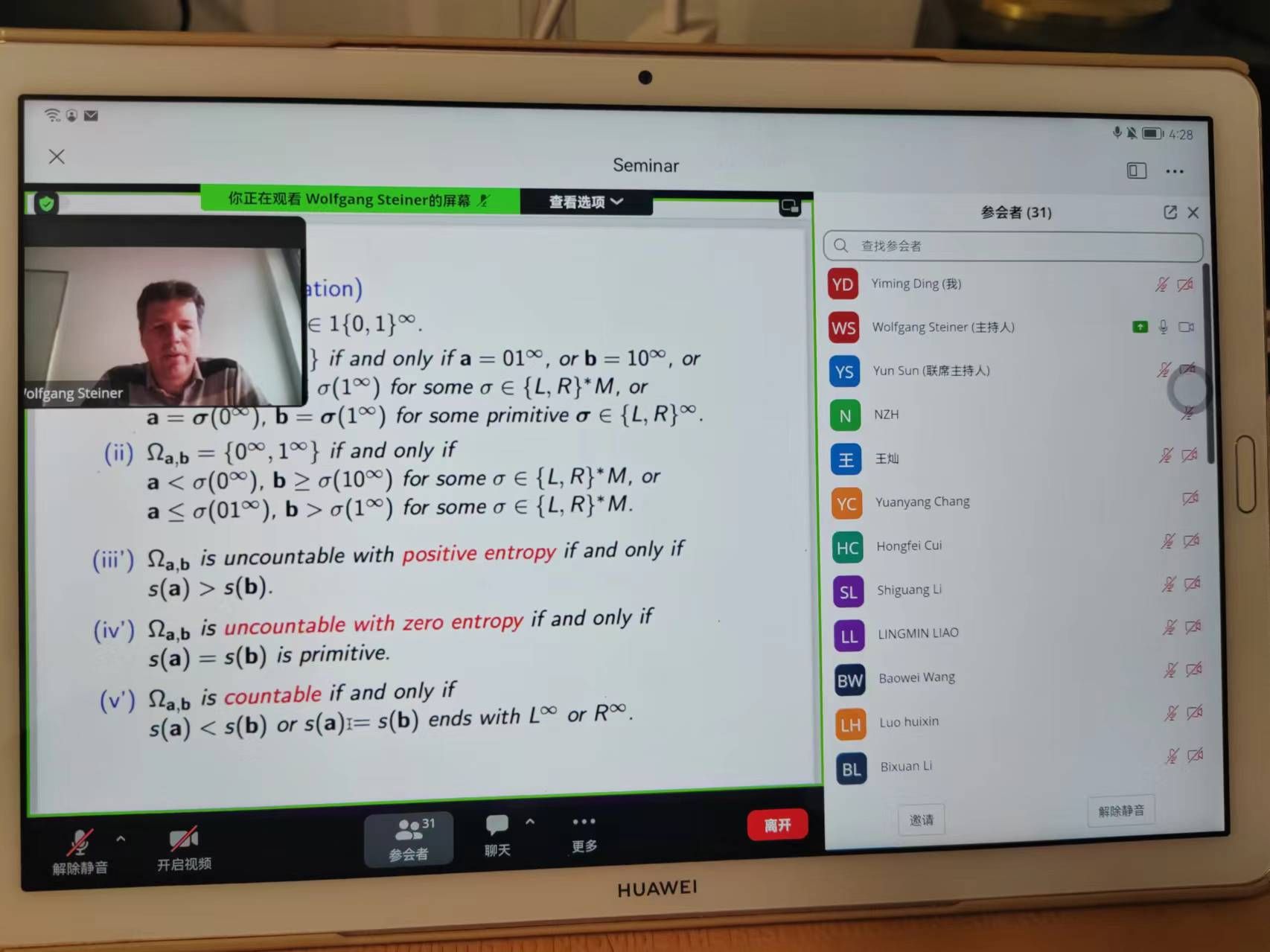 介绍了 G 函数和 K 函数的性质,包括这两个函数是关于q0和q1对称的,并且连续递减、几乎处处可微,同时满足 G 函数和 K 函数的集合Hausedorff 维数为 0 。最后对于 S-adic序列的特征提出了简单的刻画。报告吸引了武汉大学、华中科技大学、华南理工大学、深圳大学、武汉理工大学等学校的师生参与。
