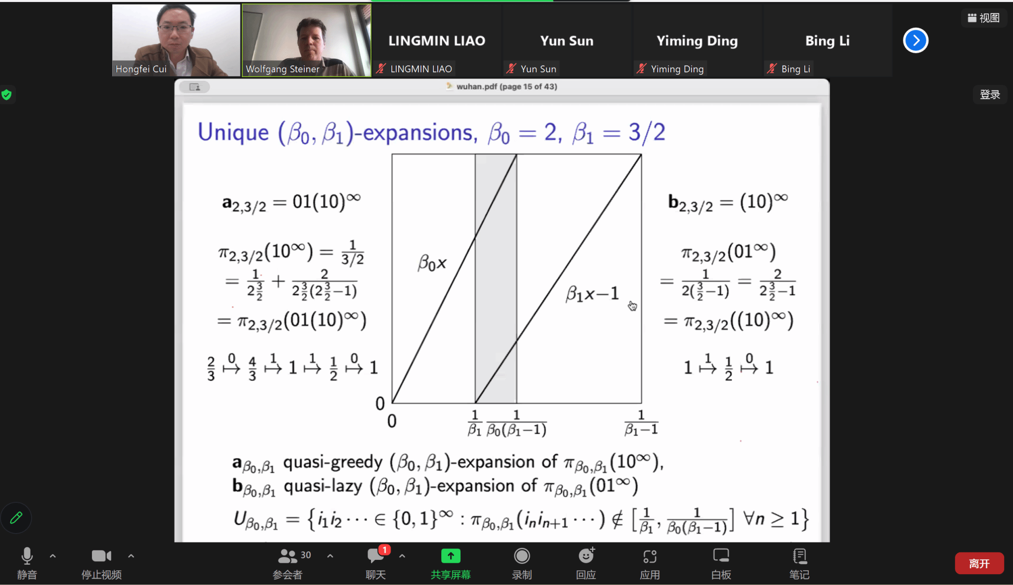 报告中,Steiner 教授介绍了他与数学家Vilmos Komornik,Yuru Zou合作的最新研究成果。从实数的(q0,q1)展开开始,介绍了可唯一(q0,q1)展开的集合,并给出 G 函数与 K 函数的具体表达式。其中G 函数能够划分不平凡的集合,K 函数能够划分不可数的集合,且使用图像可视化了这一结果。随后