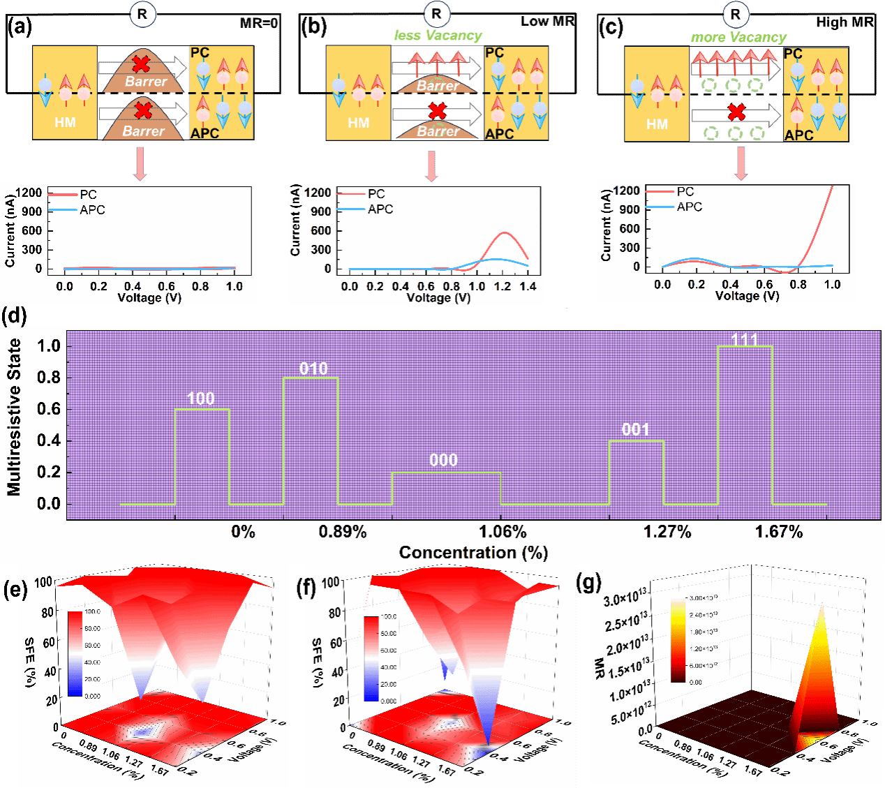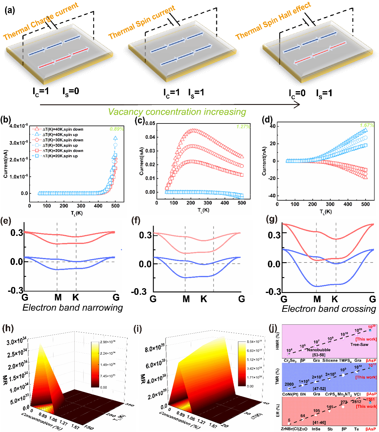 通过第一性原理计算结合非平衡格林函数方法,系统研究了β-AsP从掺杂到空位引入的电子离域工程,以实现纳米器件多功能的高性能输出。结果表明,As和P原子空位作为等效位点,可以导致β-AsP全电学性质转变,并且在不同空位浓度下初步探讨了半金属和金属性质转变的机理。这是由于空位位置最近的三个相邻原子所产生的电子离域和不对称电子态导致最高已占据分子轨道(HOMO)和最低未占据分子轨道(LUMO)向费米能级移动并发生自旋极化。此外,电源控制逻辑器件模拟表明,在所有空位浓度下,自旋滤波效果都接近100%,在高浓度空位下,TMR达到1013%。通过控制温差和电极温度,可获得高达1039%的HIMR,实现了纯电荷电流到纯自旋电流的转换,这是迄今为止的最高报道。这项工作表明,离域电子能够以“0”和“1”的创造性编码逻辑数字信息满足未来多样化的逻辑纳米器件。