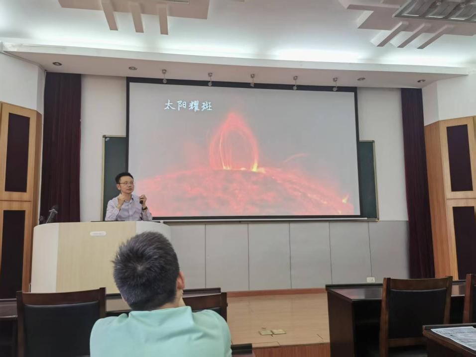 陈教授深入浅出地介绍了天文学研究的乐趣以及太阳爆发现象的科学本质,并重点介绍了太阳爆发对空间环境、航空航天、导航通信、电网等可能造成的灾害性影响,通过详实案例构建起立体认知框架从美丽的极光到加拿大魁北克大停电,从多个跨学科案例揭示了空间天气预警的重要性。报告中穿插了太阳物理研究及相关的历史小故事,并与学生开展了充分的问答互动。在解析现代太阳物理时,陈教授以"磁重联""日冕加热之谜"等核心概念为切入点,将深奥的磁流体力学原理转化为直观的物理图像。
