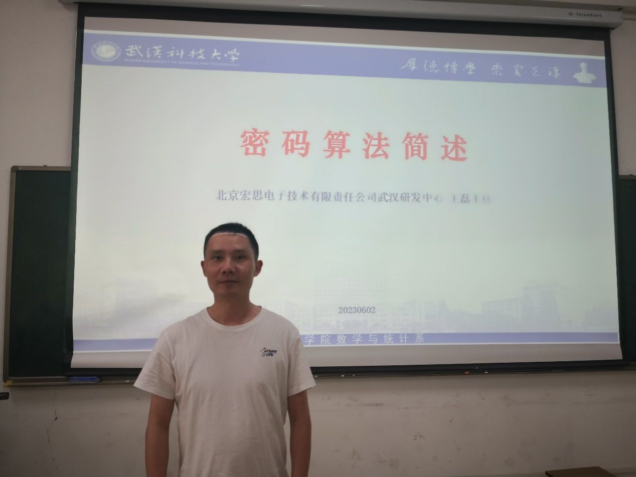 王主任首先给师生做了题为《密码算法简述》的报告,从密码技术的载体、主流公钥密码算法、技术案例和产业界的关注点四个方面做了介绍,特别是重点介绍了他们团队目前研究的kyber算法。王主任告知学生,很庆幸自己专业学习了大量数学知识,为他的工作打下了很好的基础。鼓励学生们要学好数学知识,不要用时方恨少。
