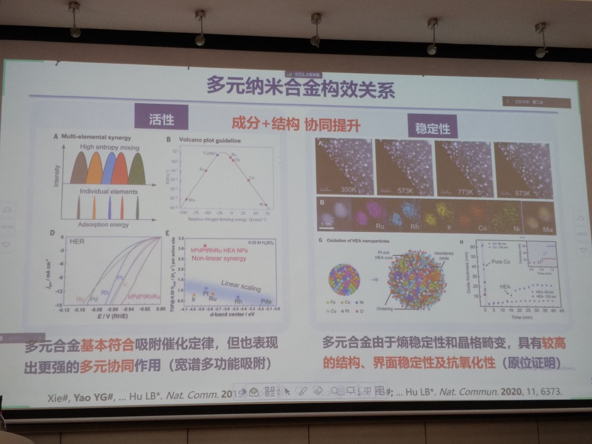 多元高熵合金催化剂因其巨大的成分空间及高熵混合结构,在能源与环境催化方面展示了巨大的潜力,往往可兼具高性能、高稳定及价格低廉等优点。然而,目前大部分高熵合金催化剂为随机混合的微观结构,使得其在催化中构效关系理解及理性设计非常挑战。姚永刚教授以高温瞬态合成方法为基础,讲述了多元高熵合金的可控合成、微观结构及表界面调控及催化应用。同时,面对海量的多元成分空间及多元混合结构复杂性,姚永刚教授简要介绍了多元复杂材料的高通量开发。